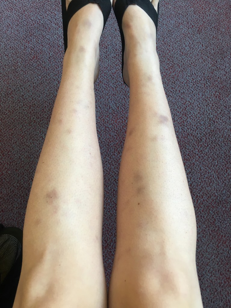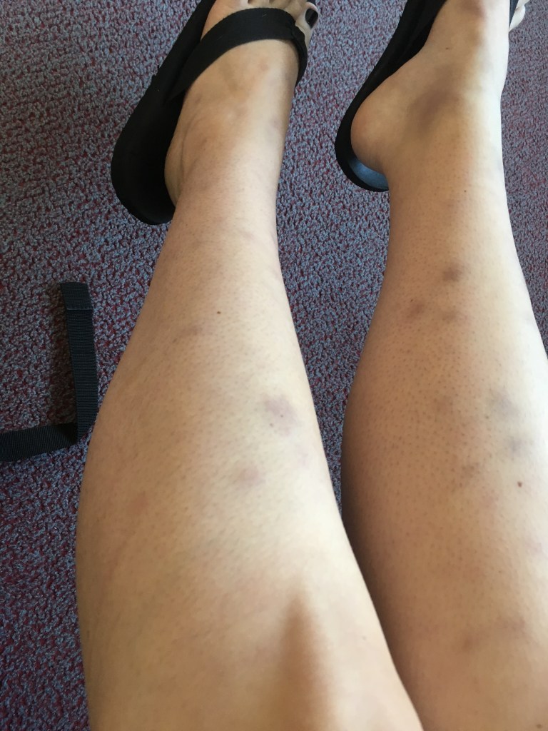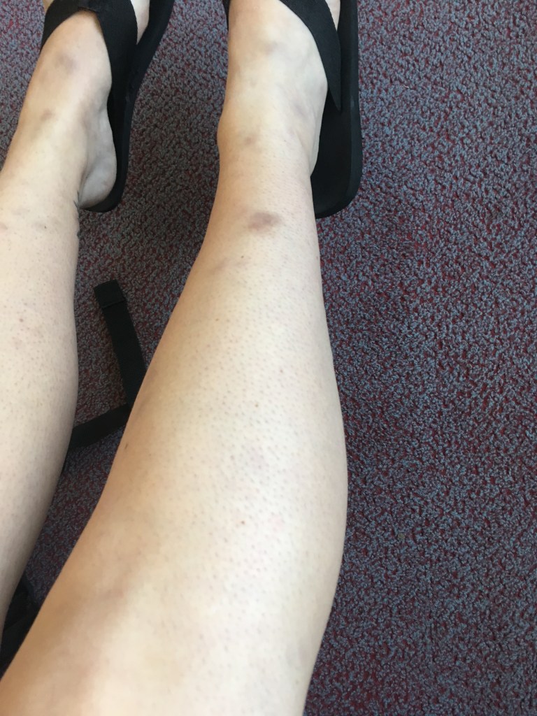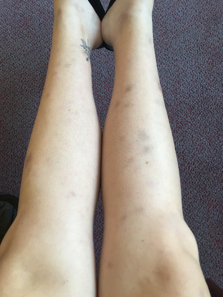 We couldn’t get a doctor’s appointment at all this week so I had to put up with it. I also had to cancel seeing a friend on the 20th because the pain kept coming back regardless of rest or no rest… The lumps also started to go a bit purple like a bruise. My bites do bruise so I still didn’t think anything much of a connection between the bumps and my pain. Standing and Walking would bring a different pain, like sharp needles and tight skin, and my knees were really weak and I would keep knocking them back and hurting myself.