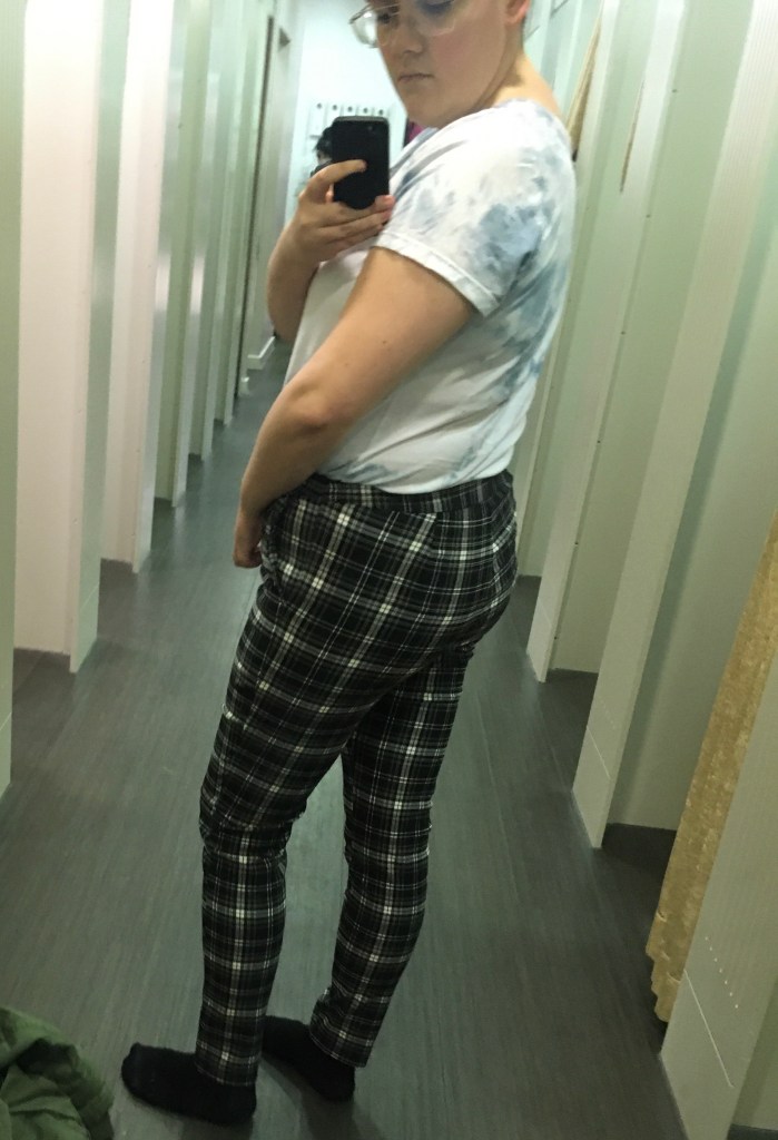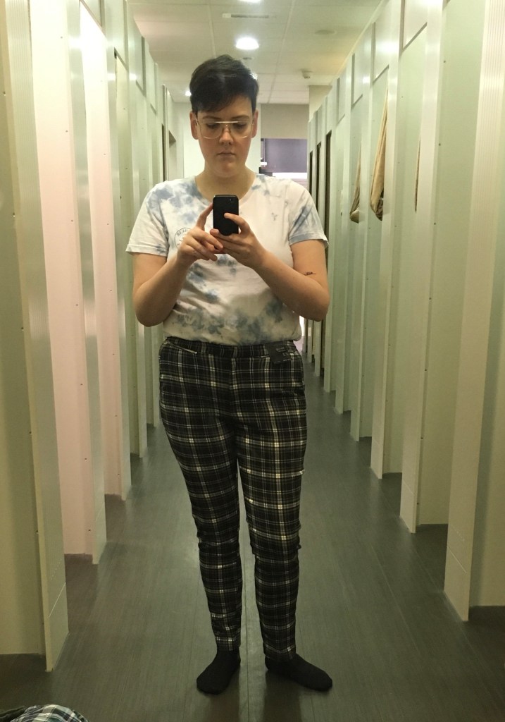 I decided on this trip (A different one, and this is the next stage of shopping) that I would try on some of the clothes that caught my eye and see which I liked on me more. I can’t trust high street sizing, even in men’s sections. It’ll say 34 waist and be too big, but pick up a pair of 34 waist shorts? Can’t do them up! But that’s a lesson I’ve learned so I have to try things on, especially if they’re a big purchase. This first pair of trousers looked nice on the hanger, but the material resembled something cheap and thin I would purchase off Blue Banana in 2010 as a teenage emo. They were dreadful and looked horrendous on. Clung to all the worst places. These were a quick no.