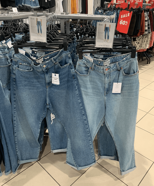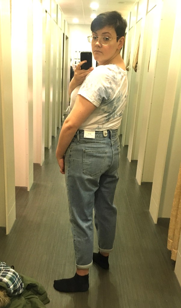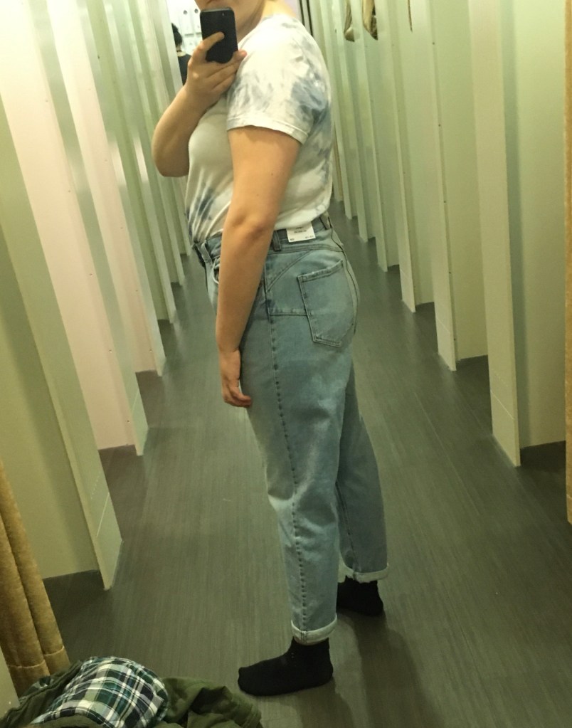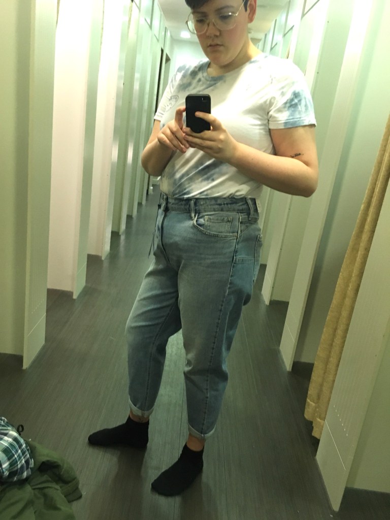 I struggle in changing rooms coz I need to get a decent distance from a mirror to see if I like the item I’m trying, so I tend to go down the end and not use a disabled cubicle even though I am entitled to it. A lot of these non-disabled stalls don’t even have a bench to sit on inbetween item or to help you pull things off or on. On this trip, this store doesn’t have seating anywhere in the changing room except right at the entrance for those waiting on someone, or in the disabled stall. Standing for too long, I get quite dizzy and sick. Plus, changing rooms can get quite stuffy and the lights are so industrial… It’s just not a good place to be sat on the floor wondering if staff could get you water or let you use a toilet. Oh, also I can’t really tell the difference in these photos which jeans are which!