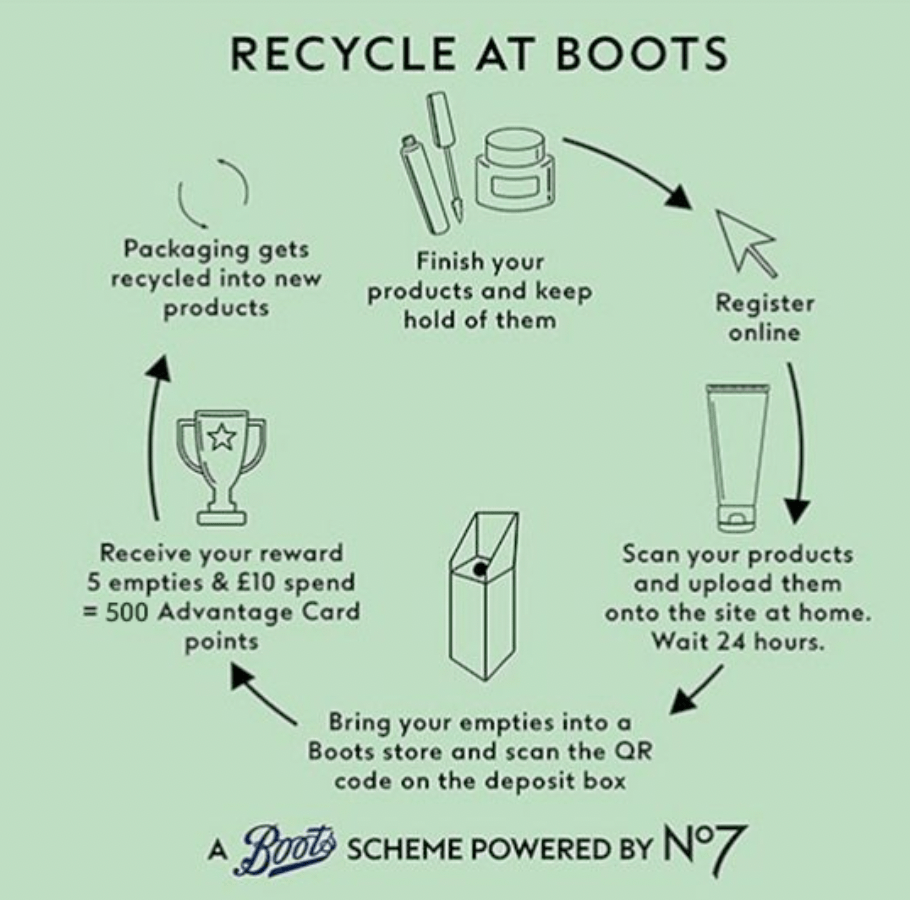 I will list some things that have surprised me that I can recycle with the Boots Scheme: sheet mask packets, old (clean) lube bottles, hand sanitiser bottles (I know we have plenty of those lying around), toothpaste (!), roll on deodorant (but NOT aerosoles), old makeup containers of any kind (including pencil products), liquid hand soaps from Tesco and other brands, and own-brand product containers from rival stores like Holland&Barrett or Superdrug.